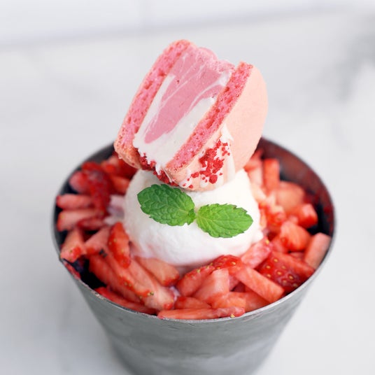 リアルいちご 1,380円(税込)当店自慢のふわふわ口溶けの良いかき氷に、新鮮な生いちごをたっぷり乗せたビンス。バニラアイスクリームの上には「いちごミルク」マカロンを乗せたボリュームあるビンスです。かき氷はミルクベースで、甘いかき氷といちごの甘酸っぱさが合うデザートです。