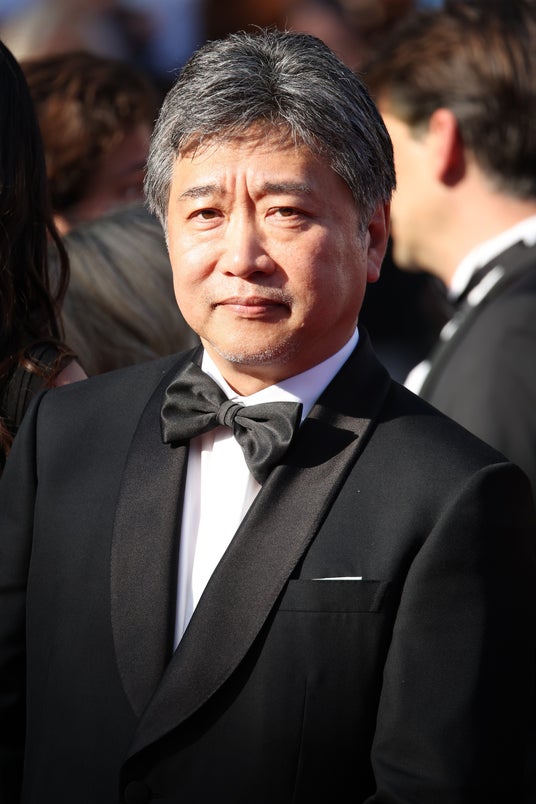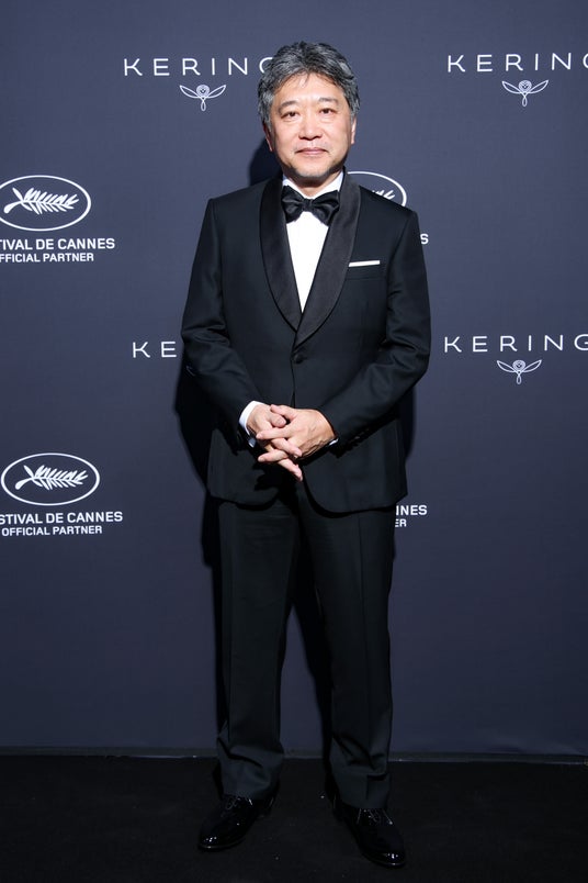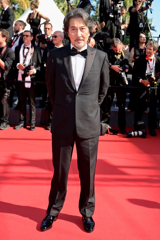 5月25日、クロージングセレモニーにて、審査員の是枝裕和監督は、ショールカラーのブラックタキシード、コットンのイブニングシャツ、シルクアクセサリー、パテントレザーのシューズを着用。