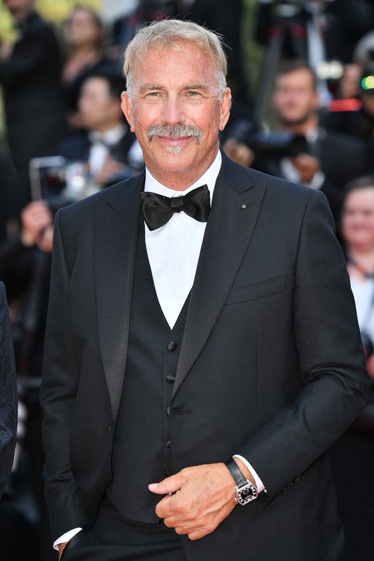 5月19日、 ケビン・コスナーが、『Horizon: An American Saga』フォトコールにて、ビスポークのカシミアとリネンの混紡スーツ、コットンシャツ、レザーのローファーを着用。