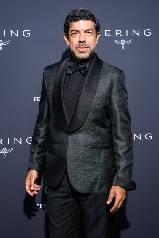 5月25日、クロージングセレモニーにて、審査員である俳優のピエルフランチェスコ・ファヴィーノは、ショールカラーのダブルブレスト ホワイトタキシード、ブラックイブニングシャツ、シルクのボウタイを着用。