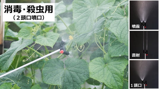 コックの切替で噴霧・直射・1頭口に噴霧状態を変更可能、噴口角度も変更できるので葉の裏まで薬剤散布が可能です。