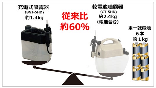 充電式噴霧器(BGT-5HD)と同等クラスの乾電池式噴霧器(弊社製品:GT-5HDの場合)は単一電池を6本使用し、乾電池だけでも約1kgの重量になります。電池を使用しないので、その分だけ重量を軽くご使用いただけます。