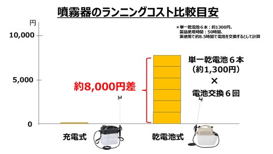 充電式噴霧器(BGTシリーズ)は家庭用コンセントに差して充電するだけなので、電気代は数十円しかかかりません。しかし、乾電池式噴霧器(弊社製品:GT-5HDの場合)は単一乾電池6本使用し、電池を交換しながら使用します。製品使用時間を50時間とした場合、約6回の電池交換が必要となり、充電式噴霧器と比較すると約8,000円ランニングコスト(*3)に差がでてきます。