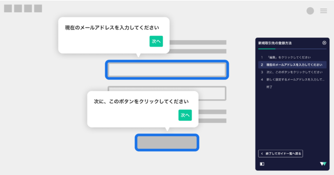 「WE UP」は、Webシステムやアプリケーションのサービスガイドを、Webサイト上でリアルタイム表示するガイドサポートプラットフォームです。ツールの管理者や企業の情報システム部、行政・教育機関などサービスの提供者が簡単かつノーコードでサービスガイドを作成できます。ガイドをツールに組み込み、共有することでツールの利用者が手順に従った操作・入力をしやすくなります。
