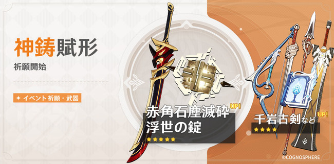 期間中、★5武器「両手剣・赤角石塵滅砕」、★5武器「法器・浮世の錠」などの出現率が大幅にUPします。