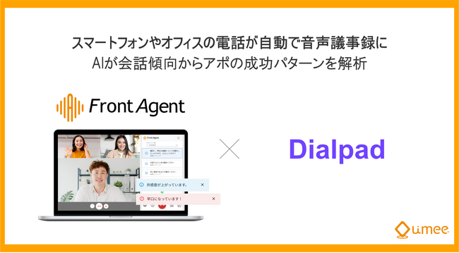 Umee Technologies株式会社(本社:東京都調布市、代表取締役:新納 弘崇、以下ユミー)は、AI商談アシストプラットフォーム「Front Agent」において、クラウドPBXの「Dialpad」との連携(以下「本連携」)を開始しました。