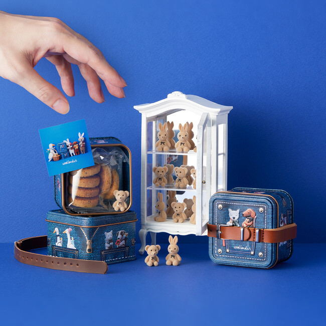 缶の中には、ふわふわの毛が生えているようなフロッキー加工が施されたミニチュアのウサギやクマの人形が1匹入っています。どの人形が入っているかは缶を開けるまでのお楽しみです。