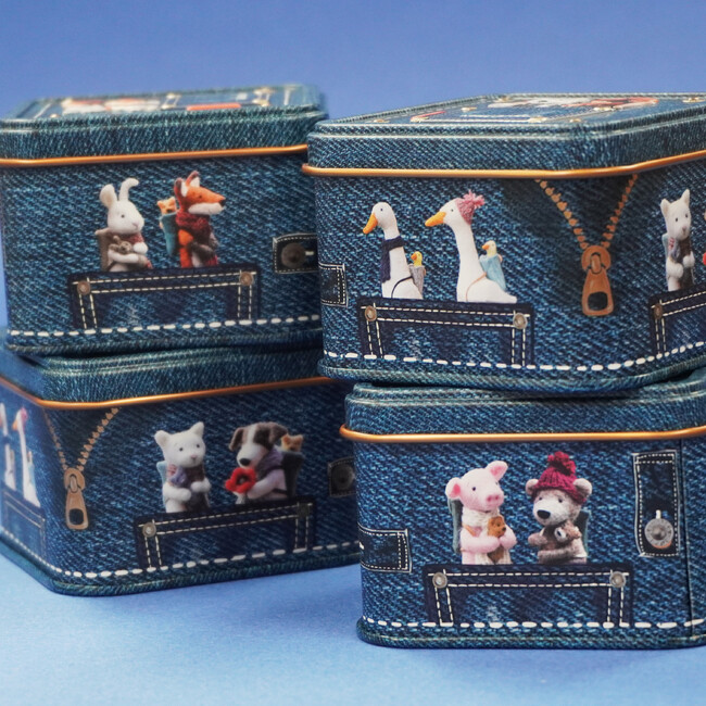 ニワトリのぬいぐるみを抱っこするオオカミ、クマのぬいぐるみを抱っこするダックスフンド、クマのぬいぐるみをおんぶするキツネなど13匹の動物たちが缶の蓋面、側面、底面や缶の中にまで至る所に描かれています。