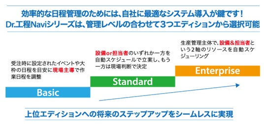 本製品は、Basic、Standard、Enterpriseの3つのエディションより構成しています。全エディション共通として、製造現場の司令塔(ナビゲータ)となる大日程ガントチャートを提供します。製品製造に関わるすべての関係者は大日程ガントチャートにより生産状況を俯瞰して見ることができるとともに、どのエディションであっても生産計画や進捗状況は大日程ガントチャートに反映されます。また、システム連携機能が標準装備されており、社内のさまざまなデータを束ねて管理することを可能としております。さらに、個別原価管理機能もエディション共通で搭載されているので、リアルタイムの原価把握が可能です。