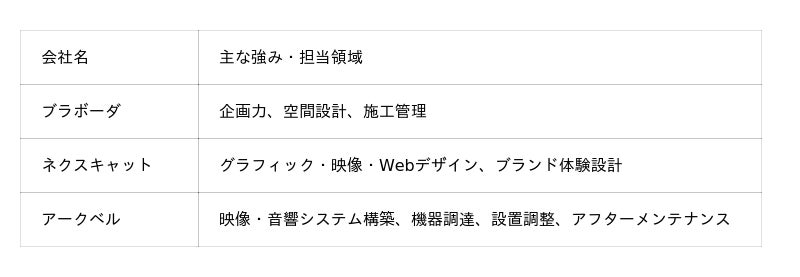 デジタルデザインを専門とするネクスキャット株式会社(以下「ネクスキャット」)は、空間デザインを専門とするブラボーダ株式会社(以下「ブラボーダ」)及び映像音響・撮影機材を提供するアークベル株式会社(以下「アークベル」)と共同で「空間プロデュース事業」の提供を開始しました。