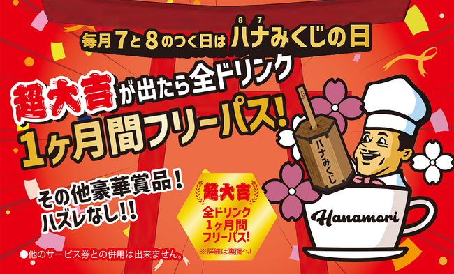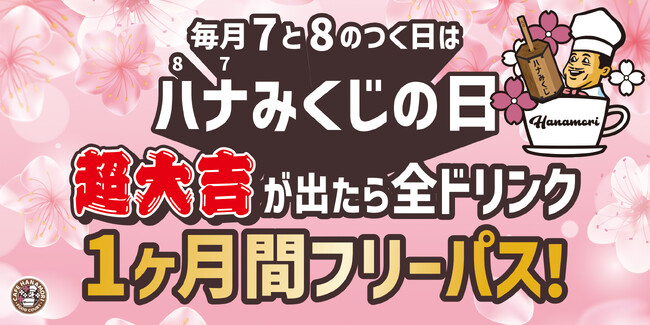 毎月7と8のつく日はハナみくじの日!超大吉が出たら全ドリンク1か月間フリーパス!!株式会社sommet farm(本社:東京都千代田区飯田橋1丁目3番8号、代表取締役:大塚 ⿓之介)は、cafe Hanamoriザ・ビッグエクストラ阿南店(住所:徳島県阿南市領家町天神前432-1 ザ・ビッグエクストラ、TEL:0884-24-8771)にて毎月7と8のつく日はハナみくじの日をリリースします。