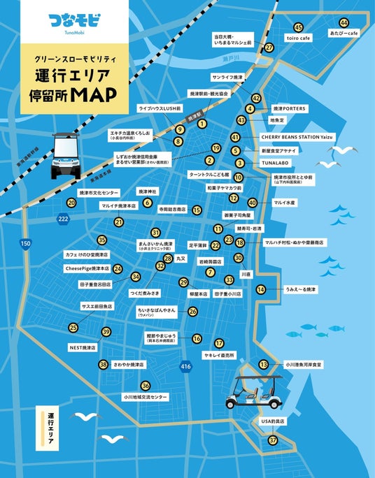 本実証実験では、2024年10月12日(土)~12月15日(日)の65日間、焼津駅南口4キロ圏内でグリーンスローモビリティ(2台/日)を走行させました。直売所・商店・観光施設・交流施設などに設置した45カ所の停留所に市内外の利用客を送迎し、地元客の移動促進や、市外客と地元との交流による経済効果やイノベーション効果の創出を図りました。利用者は1日乗り放題券700円、もしくは1回利用券300円を購入し、焼津市LINE上の専用アプリまたは車内運転手経由で購入して利用しました。