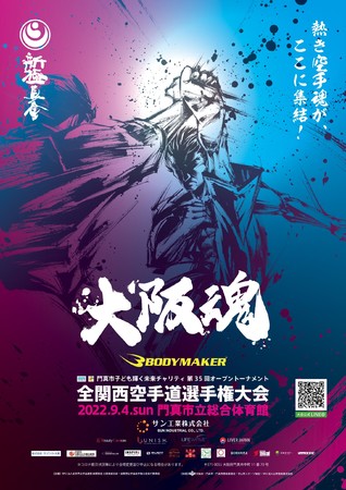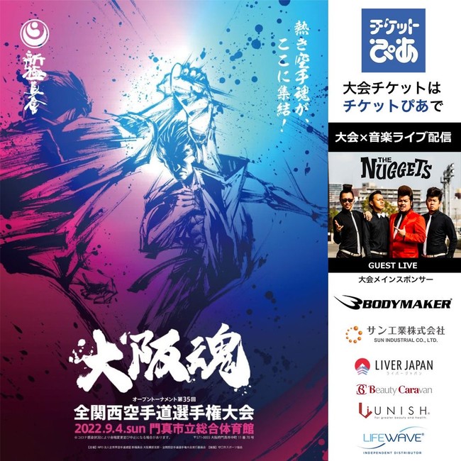 BODYMAKERがメインスポンサーをつとめる、【門真市子ども輝く未来チャリティ第35回オープント―ナメント全関西空手道選手権大会×THE NUGGETSライヴ配信コラボイベント】が2022年9月4日(日)門真市総合体育館で開催されます。3年振りの大会開催という事もあり関西地区だけでなく全国から500名の空手家がここ門真市総合体育館に集い3歳から60歳までの空手家が関西NO.1を決める熱い闘いが繰り広げられる中、まだまだコロナ感染拡大を警戒した対応を取らざる得ない中で会場の入場制限を設ける事となりました。この中で今大会をよりデジタル化や音楽ア―ティストとのライヴ配信コラボイベント、2025大阪万博をPRなど様々な角度からより空手を認知して頂ける取り組みとトピックスを上げさせて頂きます。