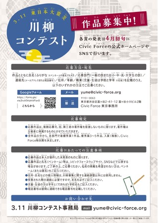 災害時の緊急支援を専門とする公益社団法人Civic Force(シビックフォース、代表理事:根木佳織)は、災害や防災・減災をテーマにした川柳コンテストを開催します。川柳の募集期間は本日から3月24日まで。小学生からベテラン川柳作家までたくさんの皆さんから寄せられる川柳作品を通じて、被災地への想いを発信するとともに、備える大切さについて一緒に考えます。