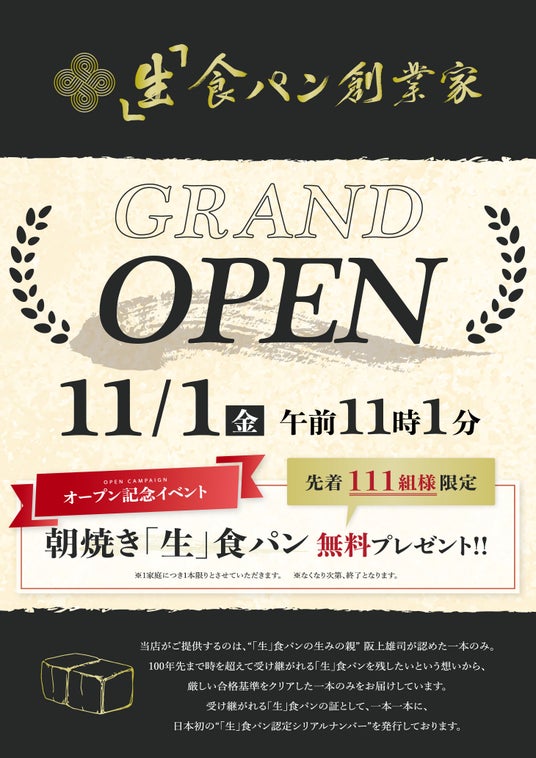 株式会社SHI-MIZU代表阪上雄司は、「生」食パンの生みの親の使命として、100年先まで時を超えて受け継がれる「生」食パンを世 の中に残したいという強い思いから この度 出生地である西宮今津に朝焼 きにこだわった「 「生」食パン創業家」を11月1日にオープンする運びと なりました。 【日本初】 受け継がれる特別な「生」食パンには、証として創業者である阪上雄司が日 本で初となる認定シリアルナンバーを発行し、1本1本に認定シリアルナン バーカードを付けてお渡し致します。 唯一無⼆の「生」食パンを是⾮、ご堪能ください。 【オープンスペシャルイベント】 11月1日は、オープン記念として 11時1分より先着ご来店111組様に無料 で朝焼き「生」食パンをプレセントさせて頂きます。 皆様にご愛顧いただけますよう頑張ってまいりますので ご来店を心よりお待ち申し上げております。