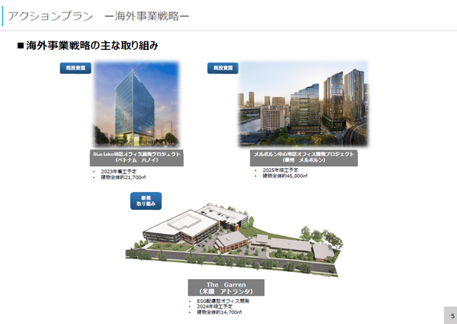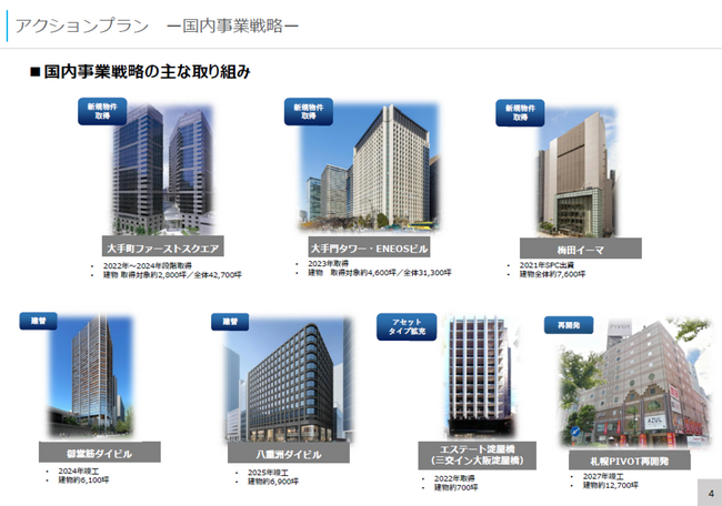 ダイビルは、前中期経営計画「“Design 100”プロジェクト Phase-II(2018~2022 年度)」において、5 つの重点施策、1.都心大型オフィスビルの取得、2.投資対象の拡充、3.海外事業の推進、4.既存アセットの競争力維持・強化、5.ビル管理事業の強化・拡大、を掲げ、大手門タワー・ENEOS ビル、大手町ファーストスクエア等の都心優良オフィスビルの取得や、当社初となる札幌エリアへの進出、豪州での開発プロジェクト参画などを果たし、また御堂筋・八重洲ダイビル建替計画を順調に推進するなど投資計画を達成しました。