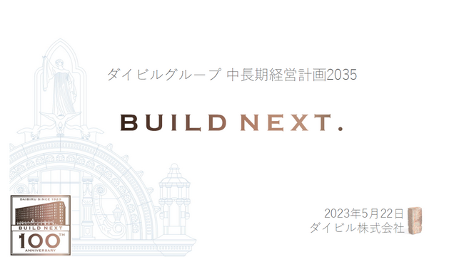「ダイビルグループ中長期経営計画2035 ‘‘BUILD NEXT.’’ 」は、本年10 月にダイビル創立100 周年を迎えるにあたり、ダイビルの次なる100 年を見据え、2035 年をゴールとする経営ビジョン・方向性を示すものです。