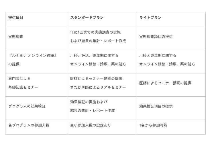 月経・妊活・更年期に対してオンライン診療の実施から効果検証まで可能なスタンダードプランと、一部機能を簡易化し女性従業員1名からでも利用可能なライトプランから選択でき、導入する企業のニーズに合わせた支援を実施します。
