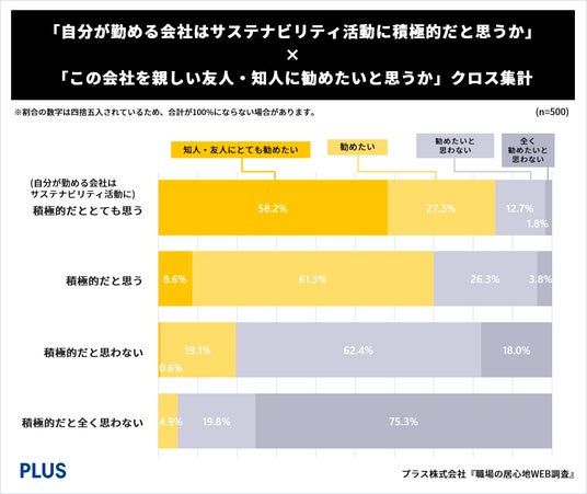 「自分の勤める会社はサステナビリティ活動に積極的」と感じている人ほど「この会社を友人・知人に勧めたいと思う」と回答。