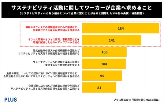 最も多く票を集めたのは「職場やオフィスでの書類削減やごみの削減など、従業員ができる身近な取り組みを推進する」、続いて「オフィス環境やオフィス家具、事務用品などを環境に配慮したものへアップデートさせる」となりました。