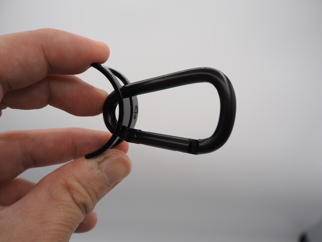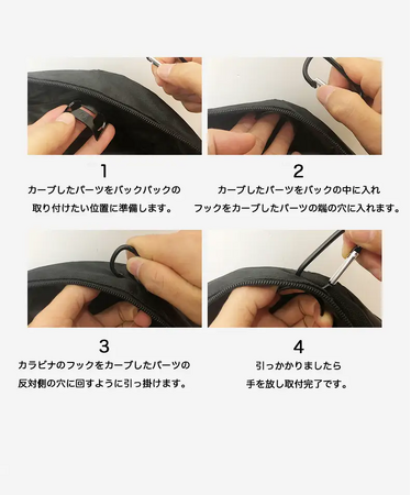 「どこでもカラビナ」は、ダイナミックアタッチメント(特許出願中)と呼ばれる着脱方法を用い、フックを付けたい場所の裏側にメス側の金具を当て、オス側のカラビナをメス側にできるスキマに通すだけで取り付けが可能です。フックから外すだけで取り外しも簡単で「アイデア次第で、いろんな場所に付けることが出来る」(EVE-Technologies・土屋 貴嗣)のが特徴です。