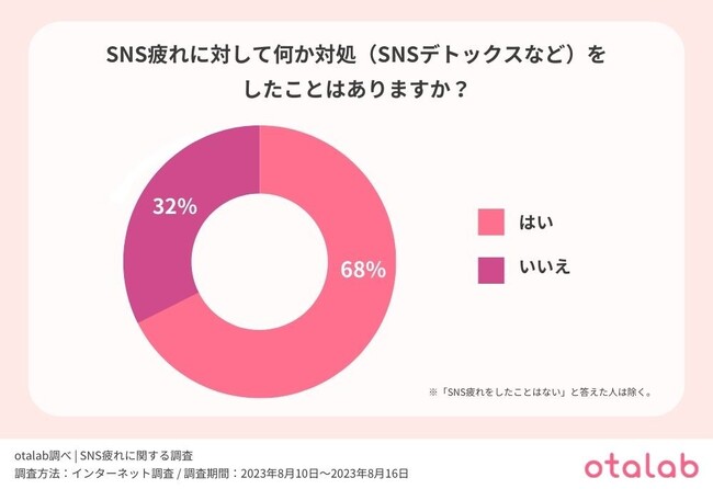 SNS疲れをした際に、SNSデトックスなどの対処を行ったことがある人は『約7割』