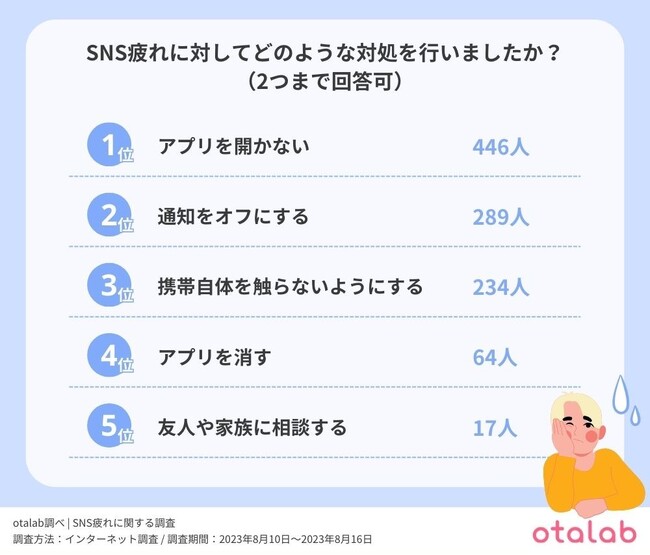 真相を知るべく調査を行ったところ、SNS疲れへの対処法の1位は『アプリを開かない』、2位は『通知をオフにする』であった。