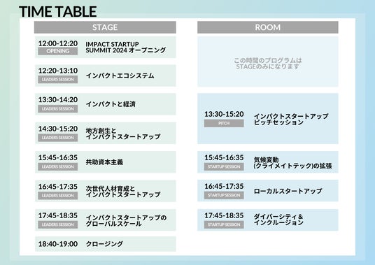 社会的インパクトの最前線に触れることをテーマに、全19のセッションをご用意。インパクトエコシステムを牽引する各界のリーダーに語ってもらうリーダーズセッションでは「インパクトエコシステム」「インパクトと経済」「地方創生とインパクトスタートアップ」「共助資本主義」「次世代人材育成とインパクトスタートアップ」「インパクトスタートアップのグローバルスケール」の全6テーマのトップランナーを招聘しました。