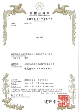 装飾業界のプロフェッショナル企業である株式会社インターコスモス(本社:大阪市北区、代表取締役社長:作道 洋介)は、オリジナル要素と環境性能を併せ持つ高品質な壁紙出力サービス『俺の壁紙』が、特許庁より弊社の登録商標として正式に登録されたことをお知らせいたします。
