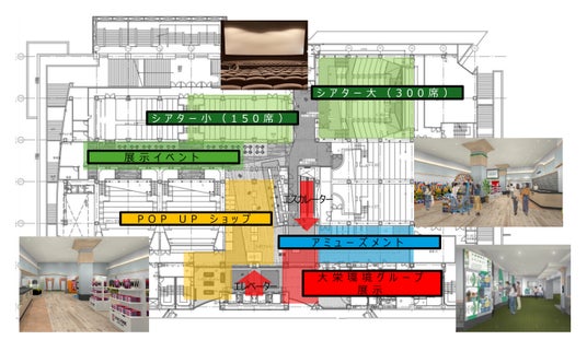 ゲーム機やプリントシール機(プリ機)・ガチャガチャなどのアミューズメントゾーン、POP UPショップなどの展示ゾーン、150・300の座席を所有するのシアターゾーンの3ゾーンで構成、特に展示ゾーン・シアターゾーンは開催されるイベント毎に「推し」が集まる目的型集客を目指します。