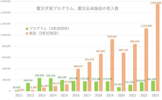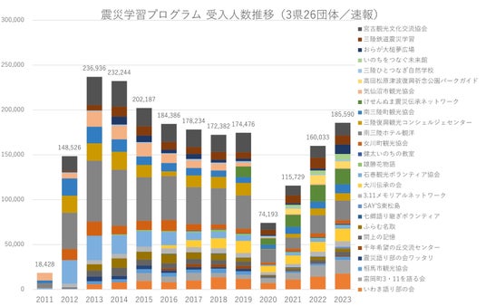 ・2023年の年間震災学習プログラム参加者数(現地参加者の合計)は185,590名。