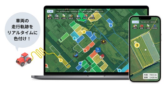 日本の準天頂衛星システム「みちびき」のCLAS(センチメータ級測位補強サービス)に対応した専用端末を使い、リアルタイムで取得する高精度な位置情報から、作業車両の現在地と軌跡をスマートフォンなどの画面上に一目でわかるように表示し、チーム全員で共有できます。自動的に記録される軌跡・データは作業記録の作成や振り返りに使え、経験豊富なベテランの仕事を新人に伝える教育ツールなどとしても活用されています。