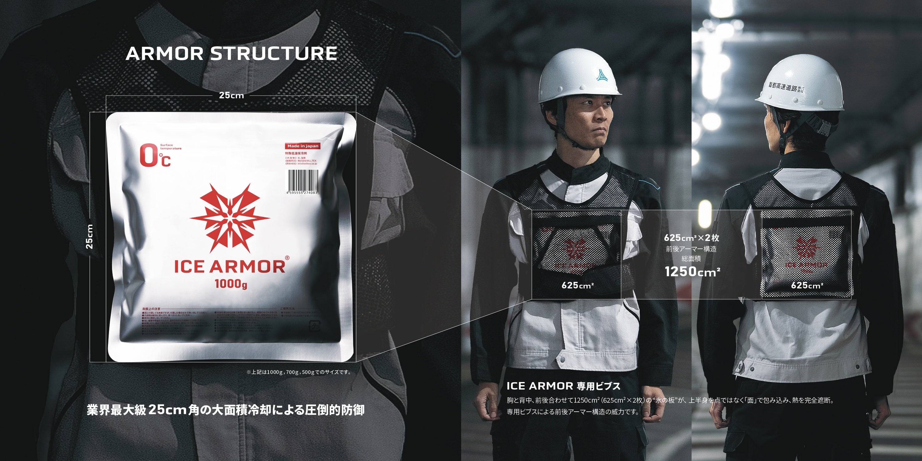 専用ビブスやウェアと組み合わせることで、インフラ保全、建設、防災などの過酷な現場環境において作業者の身体負荷軽減および熱中症リスク低減に貢献します。また、内容物は「水」と「塩類」のみの食品成分レベルの安全性に加え、車両が踏んでも壊れない高耐久設計(耐荷重試験クリア)により、ハードな現場でも安心して運用可能です。