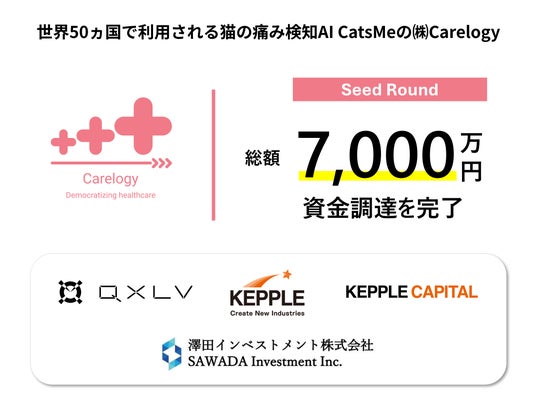 猫の痛み検知AI「CatsMe(キャッツミー)」の開発を行う株式会社Carelogy(本社:東京都中央区, 代表取締役:崎岡豪、以下当社)は、昨年より実施していたシードラウンドにおいて、QXLV(クオンタムリープベンチャーズ)、株式会社ケップルキャピタル、澤田インベストメント株式会社、その他個人投資家を引受先とするJKISS型新株予約権の発行による資金調達を完了しました。