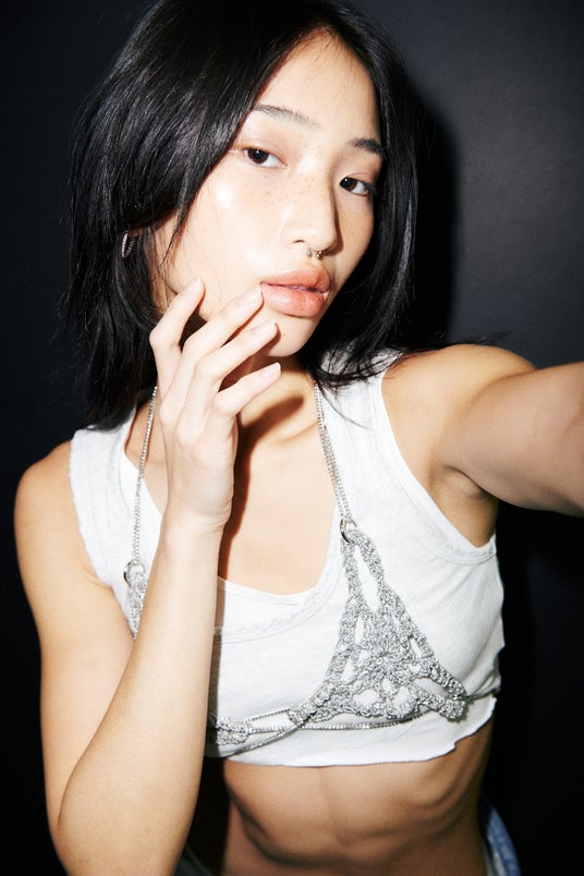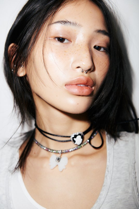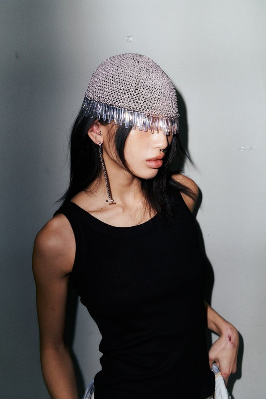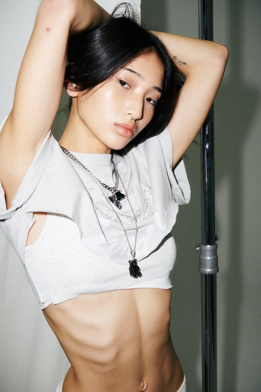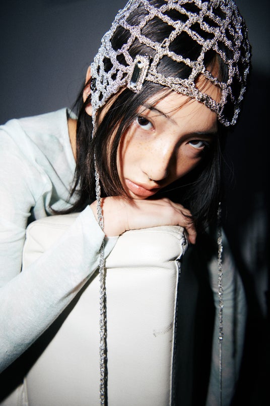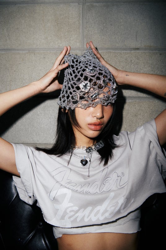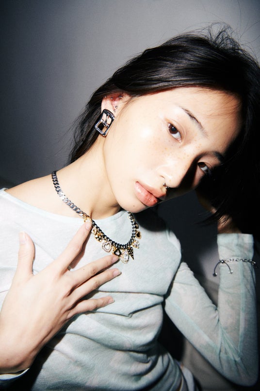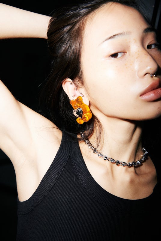 本コレクションでは、代表的なグミベアをパールやフラットチェーンと組み合わせてモードな雰囲気に。モノトーンを基調にエレガントで高級感のあるチョーカーやネックレス・ブレスレットなどを製作した。中でも手編みされたボールチェーンのヘッドビースやビスチェはデザイナー渾身の逸品。