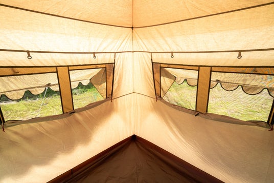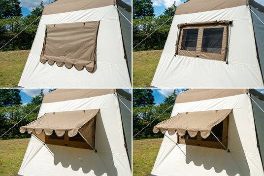 左右と後面の窓には、フリルつきのオーニングを配置することで、日差しを和らげるとともに、外からの視線を自然に遮り、テント内のプライベート空間を確保します。