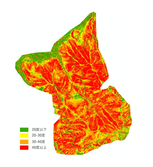 新出光不動産は、主伐を目的として熊本県八代市に約50haの森林を取得し、管理を進めてきました。2020年に発生した豪雨災害により、社有林の状況把握が困難になったことから、社有林の可視化を目的として、2023年度に京都大学大学院農学研究科小野田雄介教授と連携し、レーザドローンによる全域計測及び地形解析を行い、単木単位での樹種識別、さらには樹高情報、材積量の推定等を行いました。