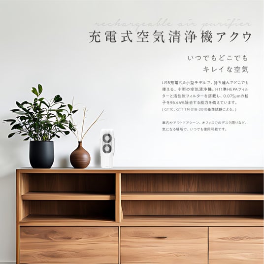 車内や旅行先、デスクなどで使える充電式の空気清浄機。いつでもどこでもキレイな空気。
