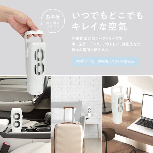 充電式の小型空気清浄機で持ち運びしやすく、車内や旅行先、オフィスのデスクなど狭い空間の空気清浄に役立ちます。