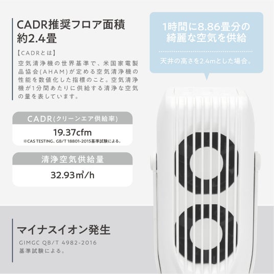 CADR(クリーンエア供給率) :19.37cfm ※CAS TESTING、GB/T 18801-2015基準試験による。