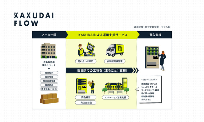 自動販売機の販売、運用支援&ロケーション営業支援サポートを致します。メーカー様は販売指示、販売管理、商品在庫管理、商品納品、販促活動などを中心に運営して頂き、KAKUDAIオペレーターが自動販売機清掃管理、商品補充、売上金回収、お問い合わせ対応など運用支援サポートをしていきます。KAKUDAIサービスの自動販売機出店から運用支援サポートを利用することにより、自動販売機での全国出店を拡大していくことが可能です。
