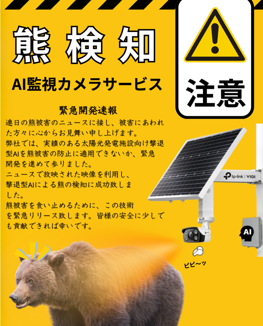 弊社が太陽光発電施設の盗難抑止として開発致しましたソーラーパネル型AI監視カメラを用いて、熊検知に対しても精度良く対応出来る開発に成功致しました。