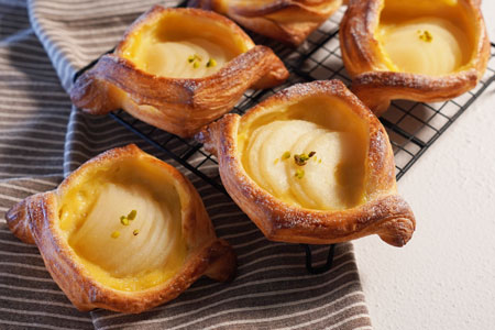 しっとりとした上品な甘さの洋なし、なめらかな口当たりのフィリング、サクサクとしたデニッシュ生地の食感が楽しめます。