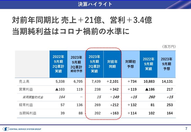 対前年同期比 売上+21億、営利+3.4億当期純利益はコロナ禍前の水準に