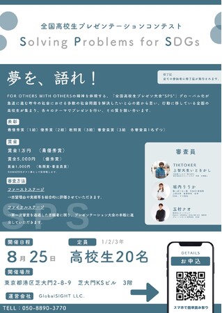 教育系スタートアップCEOの上智大生玉村と、総フォロワー15万人のティックトッカー上智大生いとをかしがコラボして、全国高校生プレゼンテーションコンテストSPS(Solving Problems for SDGs)を開催。全国の高校生のSDGs意識を高める、高校生の今までの取り組みを発表する場を設ける、社会問題の解決策を考え社会に貢献する、それらの想いを込めて、このプレゼン大会が開催されます。