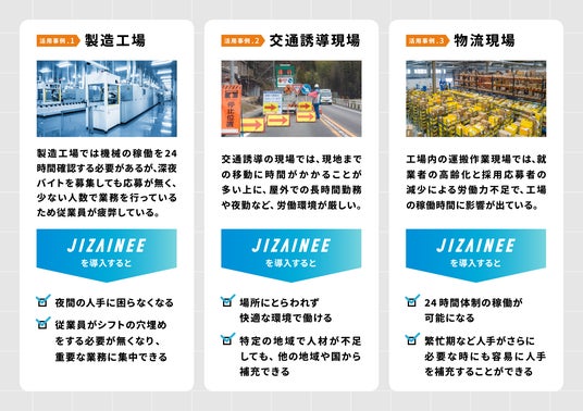 そこで、「すべての人が時空を超えて働ける世界へ」をミッションとして掲げているジザイエは、勤務形態を多様化できる既存サービス『JIZAIPAD』と組み合わせて利用できる、現場仕事と遠隔就労者をマッチングする新サービス『JIZAINEE』を開発し、法人向けβ版サービスの提供を開始しました。
