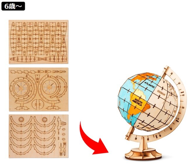 細かいパーツを組み立てると18cmサイズの地球儀に!色を塗って世界を覚えよう。
