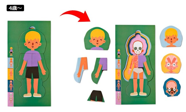 服を着た状態からスタート!表面から、筋肉→内臓→骨の順番で、感覚的にからだのつくりを理解できるパズル