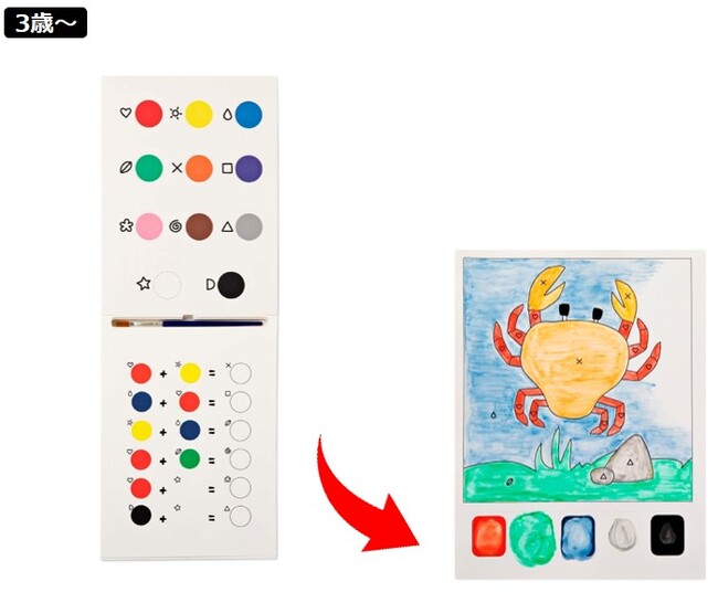 図のように色を混ぜて、記号に沿って色を塗る。赤と黄でオレンジ、赤と白でピンク。色は無限大