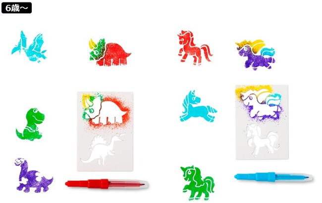 フッとペンに息を吹きかけて描いていく新感覚のペン。吹き方で色の変化が楽しめます。5色のペン&ステンシル付き